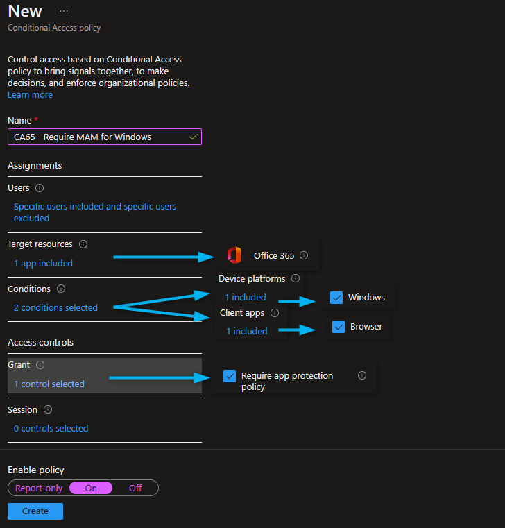 Finally, we need to configure the following conditional access policy as the last step. This policy will enforce the app protection policy we created earlier, ensuring that users cannot access the resources without being protected by Mobile Application Management (MAM).